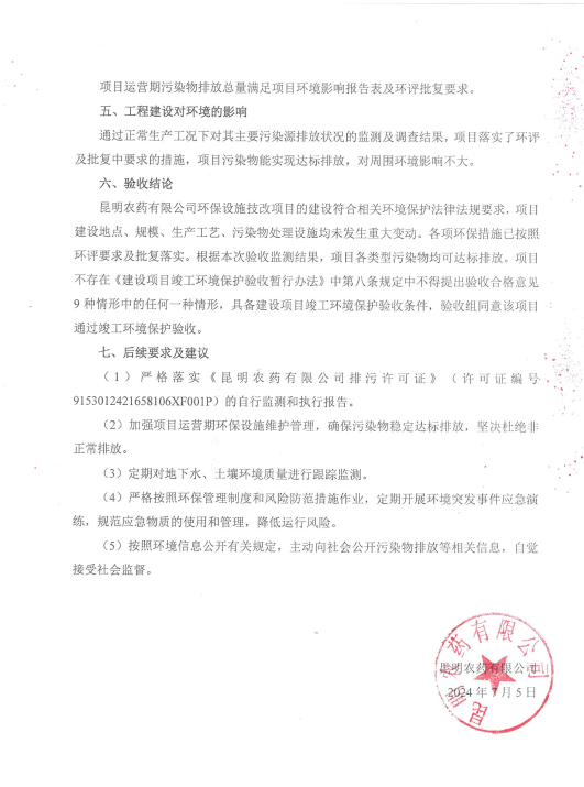 項目按《建設項目竣工驗收環(huán)境保護暫行辦法》 中規定的驗收不合格情形對 項目逐一對照核查, 并根據項目設計、 施工、 污染治理設施的建設和現場(chǎng)檢查情 況, 該項目未出現規定的中的驗收不合格情形。 8.2 驗收總體結論 綜上所述, 昆明農藥有限公司環(huán)保設施技改項目的建設符合相關(guān)環(huán)境保護法 律法規要求, 項目建設地點(diǎn)、 規模、 生產(chǎn)工藝、 污染物處理設施均未發(fā)生重大變 動(dòng)。 各項環(huán)保措施已按照環(huán)評要求及批復落實(shí)。 根據本次驗收監測結果, 項目各 類(lèi)型污染物均可達標排放。 項目不存在《建設項目竣工環(huán)境保護驗收暫行辦法》 中第八條規定中不得提出驗收合格意見(jiàn) 9 種情形中的任何一種情形, 具備建設項 目竣工環(huán)境保護驗收條件, 達到驗收要求。 8.3 建議 ( 1 ) 嚴 格 落 實(shí) 《 昆 明 農 藥 有 限 公 司 排 污 許 可 證 》 ( 許 可 證 編 號 |